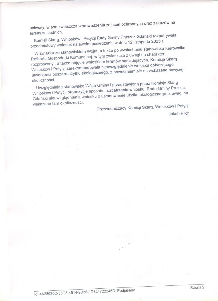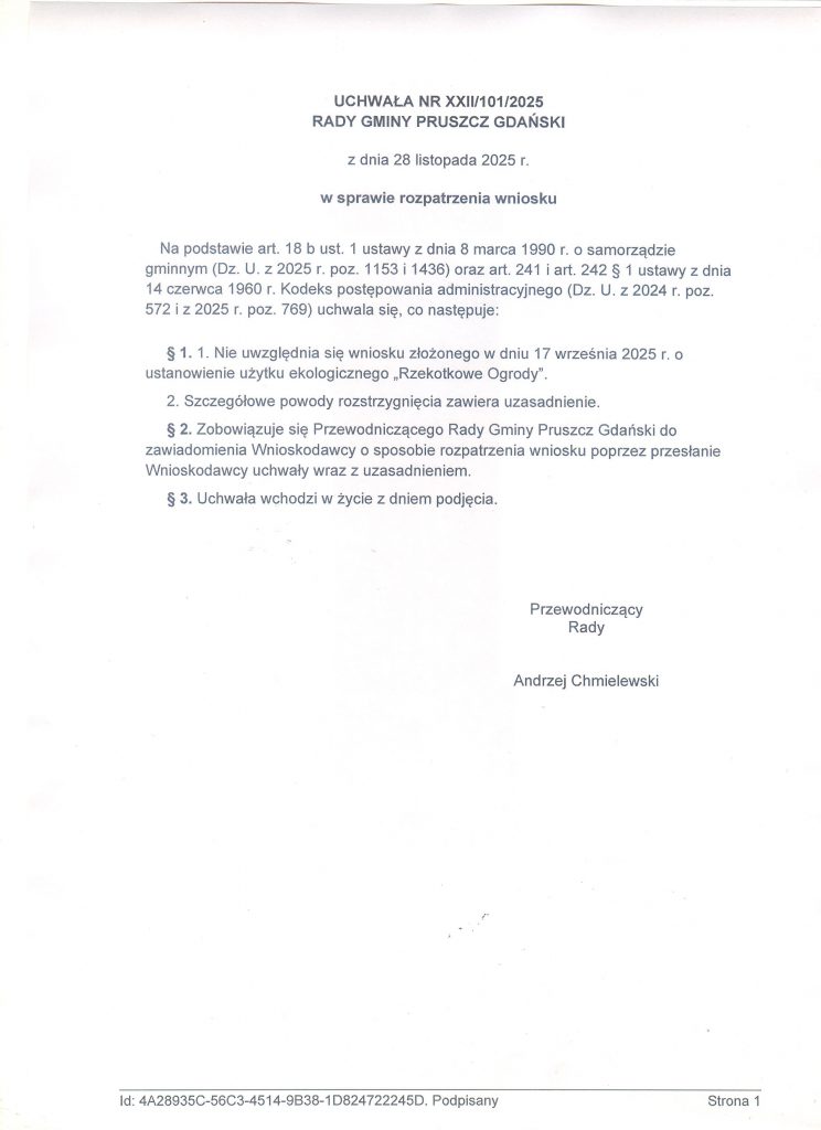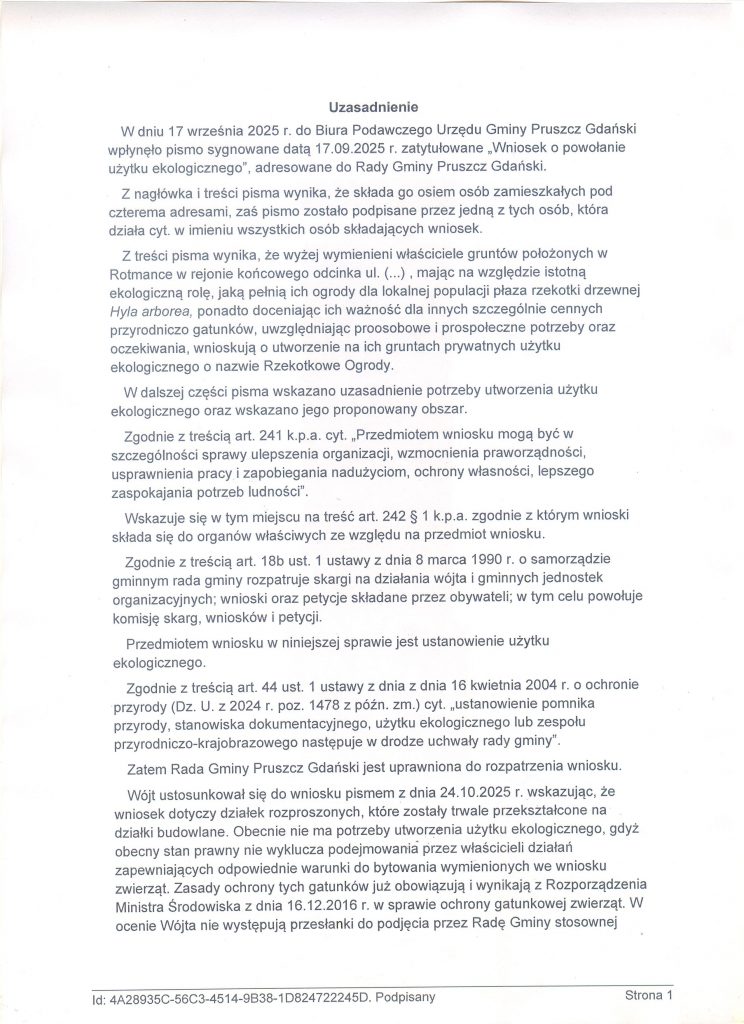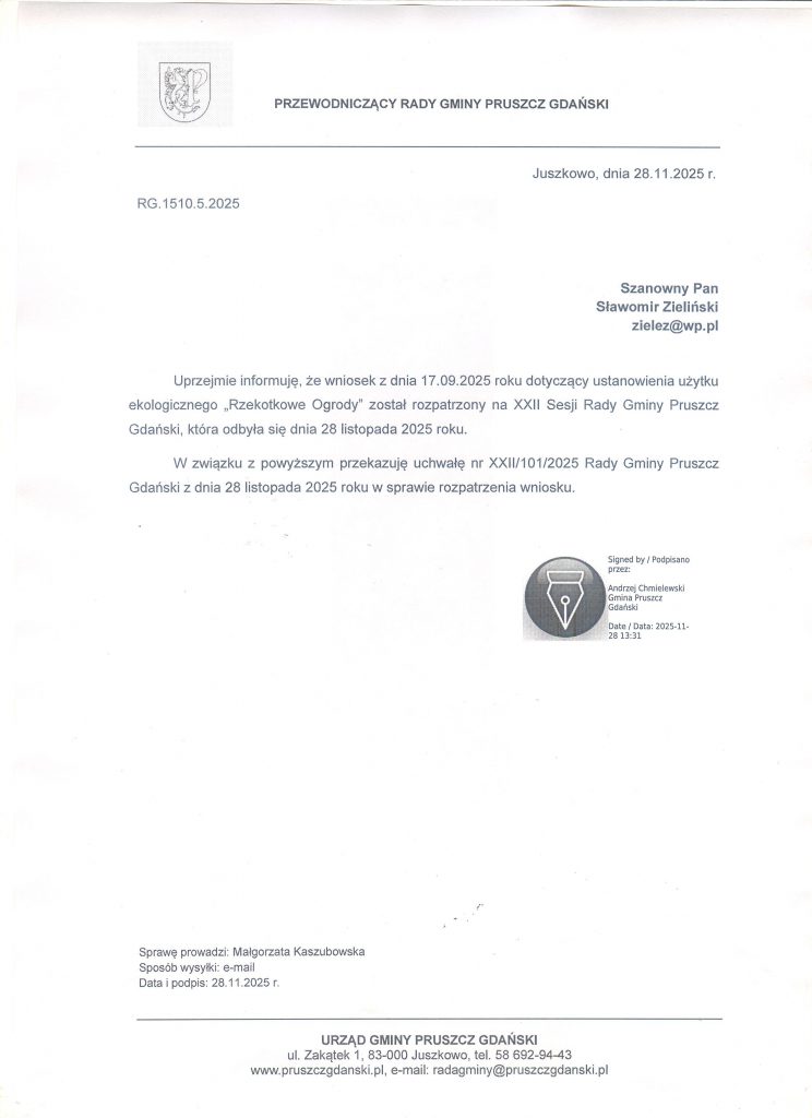 Pismo "pierwotne" w sprawie wniosku o utworzenie użytku ekologicznego "Rzekotkowe Ogrody" wraz z całością dokumentacji złożono do Urzędu Gminy w Pruszczu Gdańskim w dniu 17 IX 2025 r.