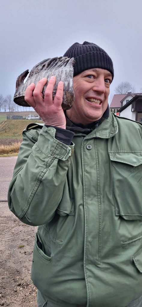 Nowa Huta. Paweł i przedtrzonowy ząb mamuta Mammuthus primigenius. W czasach, gdy wymierały mamuty w środkowej Europie, także tutaj, formowała się rzeźba terenu Lasów Mirachowskich, która jest wielkim ich walorem, implikując ponadto całą pulę innych walorów. Ale to już temat na inną opowieść. fot. Sławek Zieliński